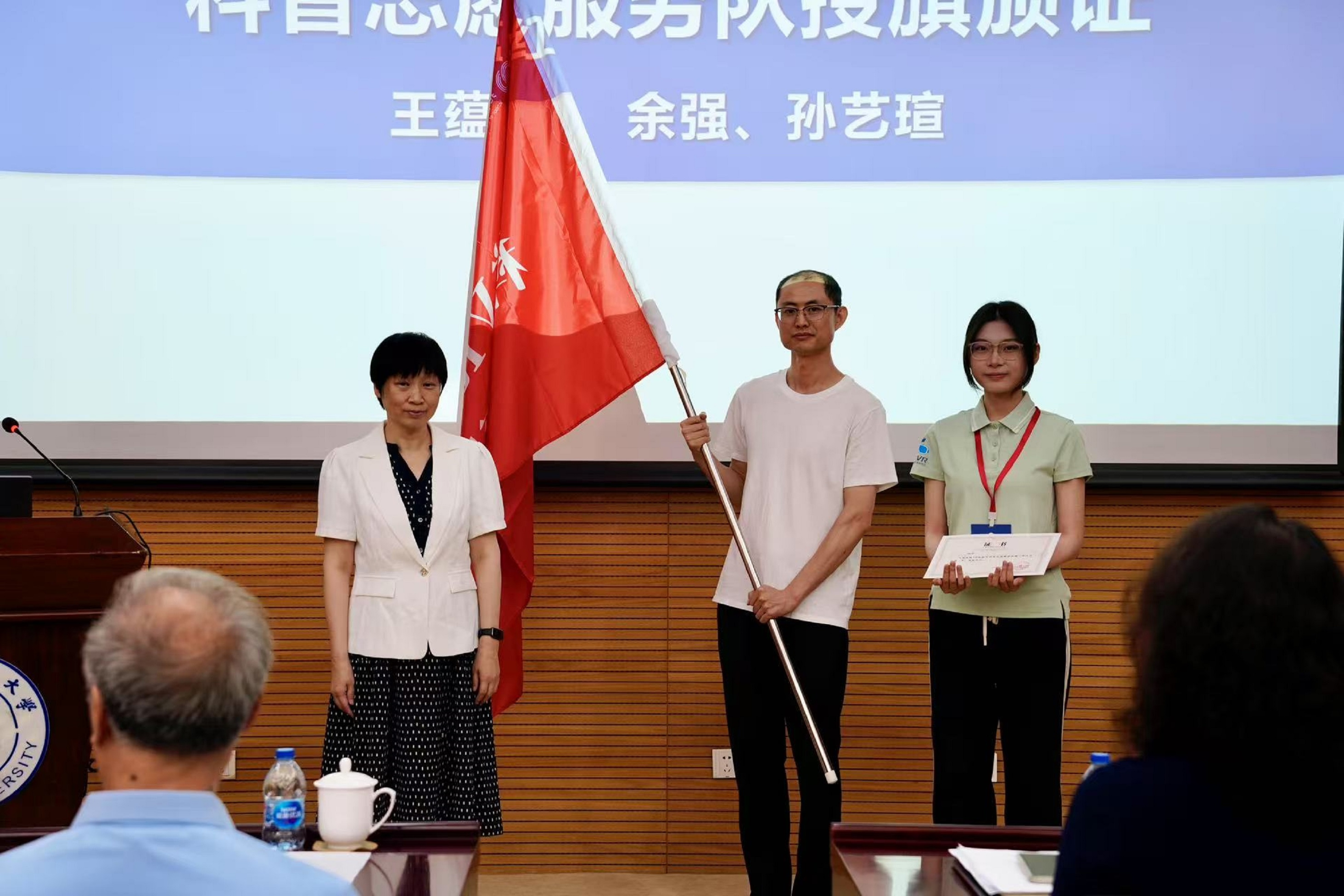 在庄严的授旗环节中,澳门永利6774院长王蕴红教授为科普志愿服务队授旗并颁发证书,标志着这支年轻队伍正式肩负起科学普及的使命。